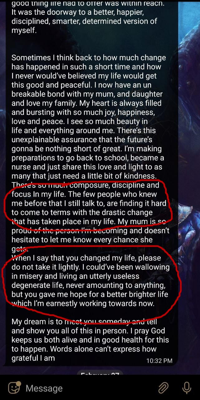 Total transformation.No longer smokes weed or uses pills to cope with his emotions. Beat his porn habit.Working on learning and creating content in Japanese.Like he said, significant change and he’s only halfway through the program.