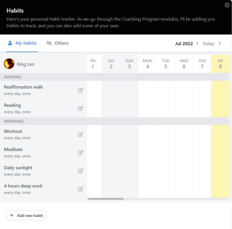 Track daily, weekly habits. Add custom habits to track or follow the plan I create, based on your unique training requirements. Accessible to both you and coach for accountability.