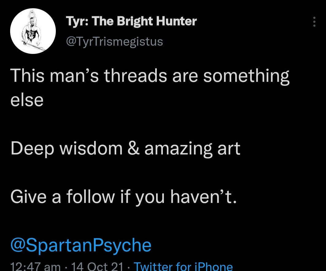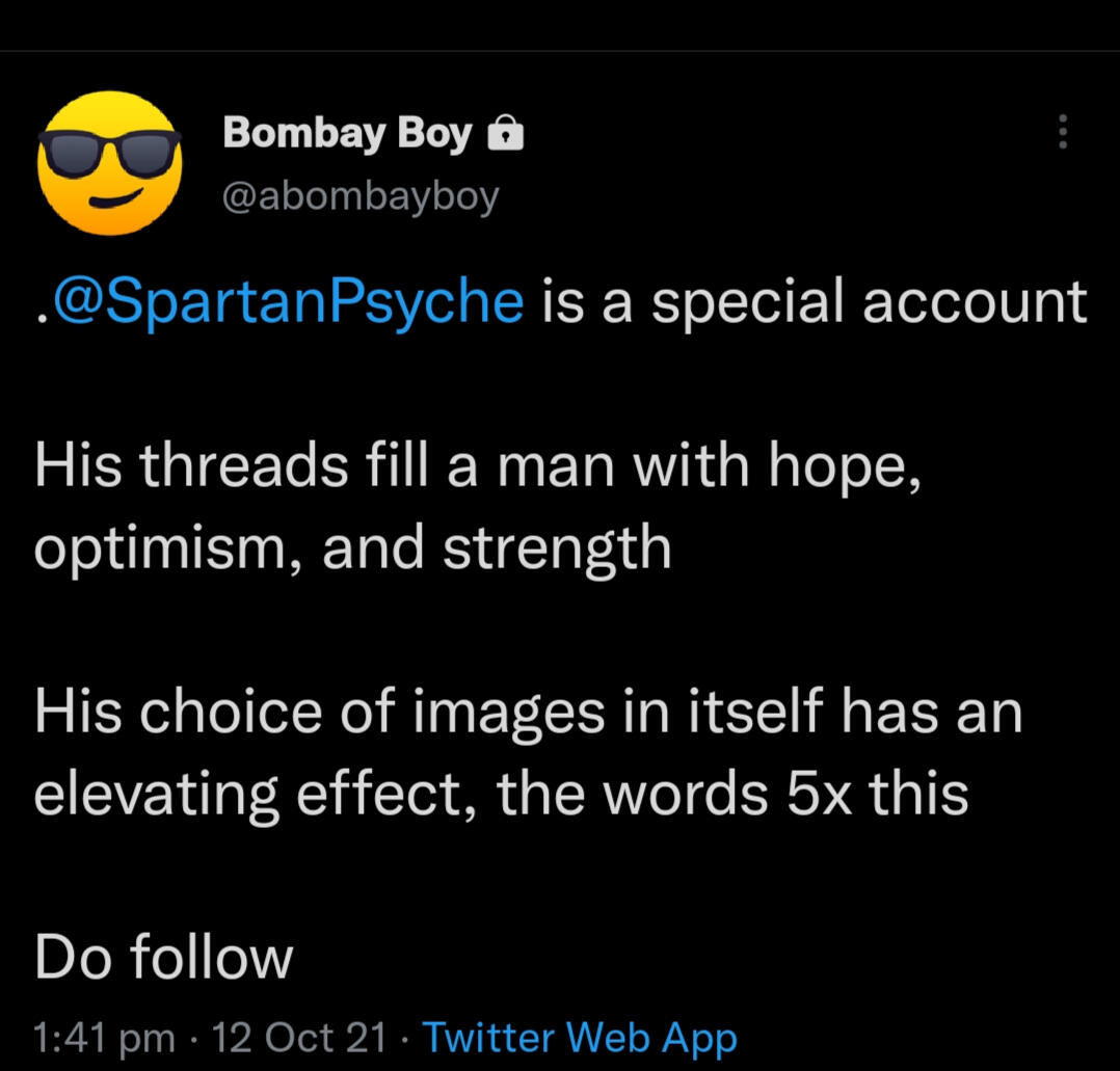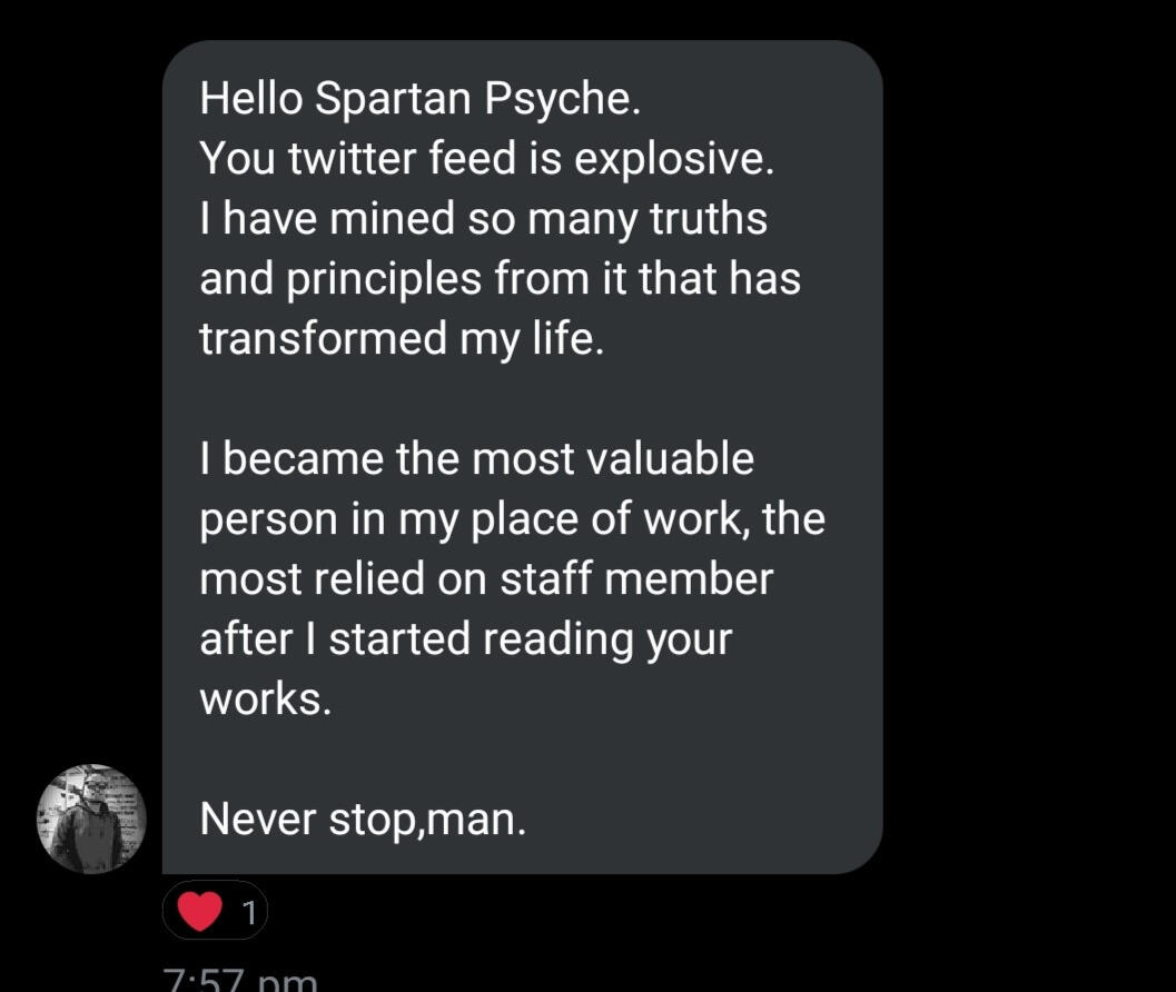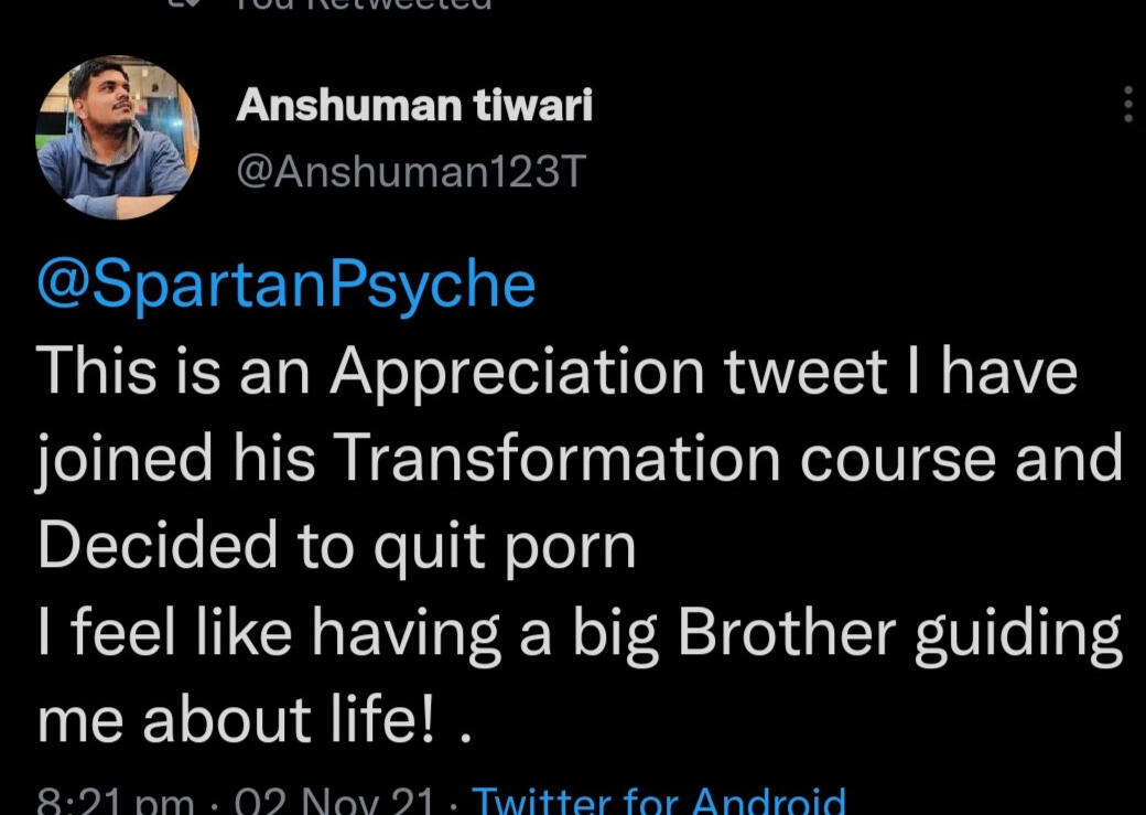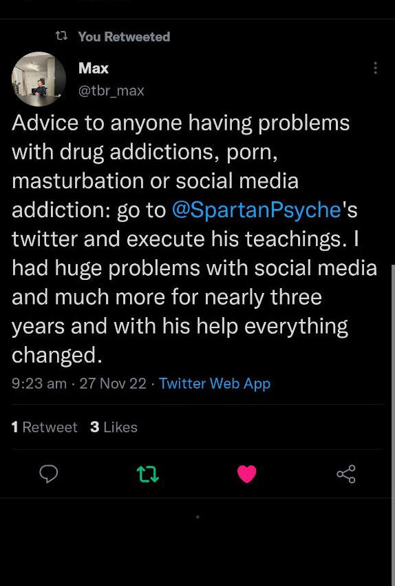 I have followed @Spartanpsyche's advice on pornography & masturbation. His advice is gold and I've never relapsed since then. ** He is by far the best account on twitter on life transformation.
