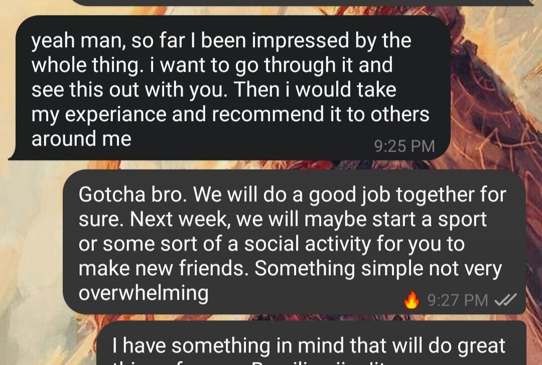 Quit smoking, binge eating, Got over his ex, found a new girlfriend, lost a ton of weight, training kickboxing, lifting weights & eating right.Complete dopamine resetOn his way to getting shredded.Our program has left such an impression that he chose to be on permanent retainer.